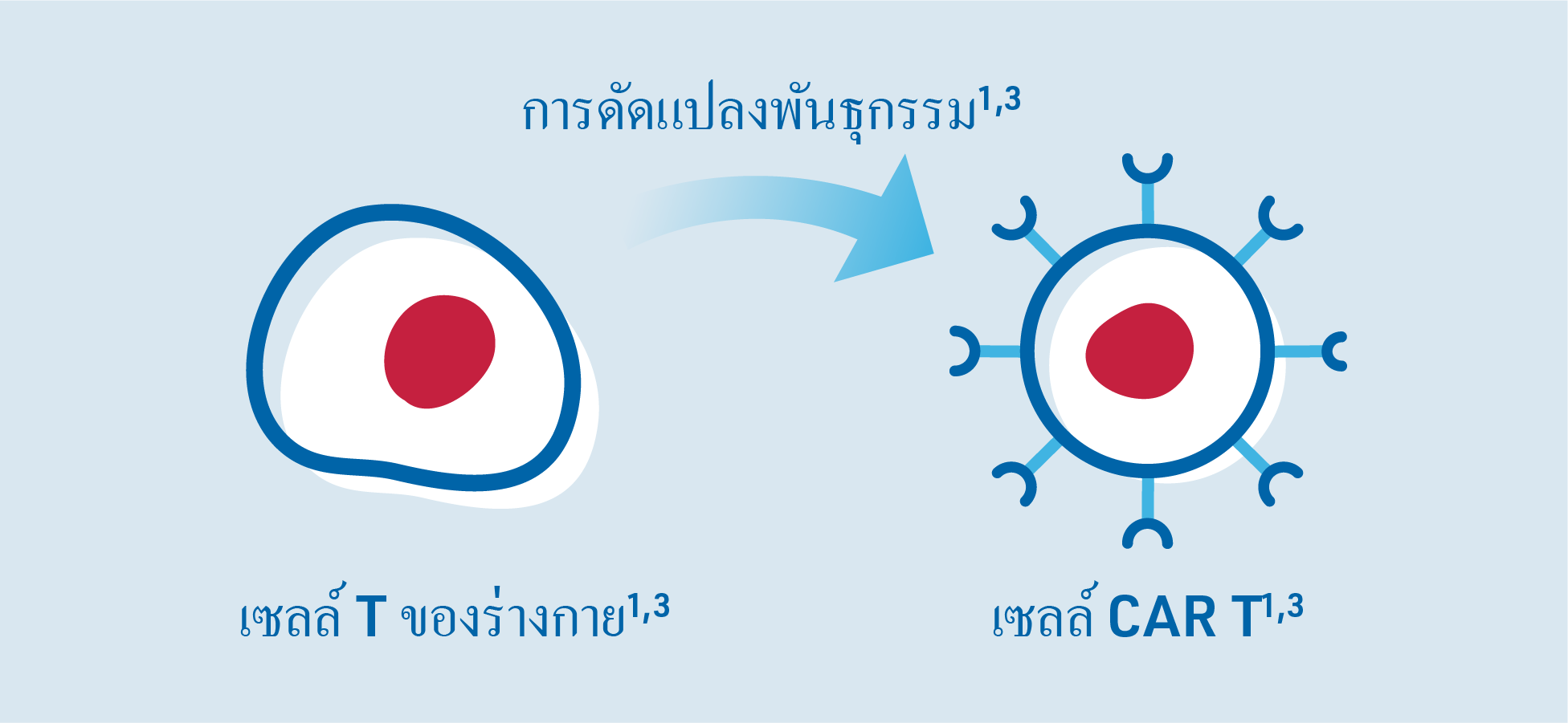 เซลล์ CAR T ถูกผลิตขึ้นแยกสำหรับผู้ป่วยแต่ละรายโดยใช้เซลล์ T ที่นำมาจากร่างกายของผู้ป่วยเอง1 เซลล์ T เป็นส่วนหนึ่งของระบบภูมิคุ้มกันของร่างกายเพื่อช่วยต่อสู้กับการติดเชื้อ เช่น ไวรัสและแบคทีเรีย ในขณะเดียวกันก็กำหนดเป้าหมายไปที่เซลล์ที่ผิดปกติของร่างกาย รวมถึงเซลล์มะเร็ง อย่างไรก็ตาม เซลล์มะเร็งมักจะพัฒนากลไกเพื่อหลบเลี่ยงการตรวจจับของระบบภูมิคุ้มกัน ทำให้เซลล์มะเร็งสามารถหลบหนีจากการตอบสนองของระบบภูมิคุ้มกันเหล่านี้ได้3