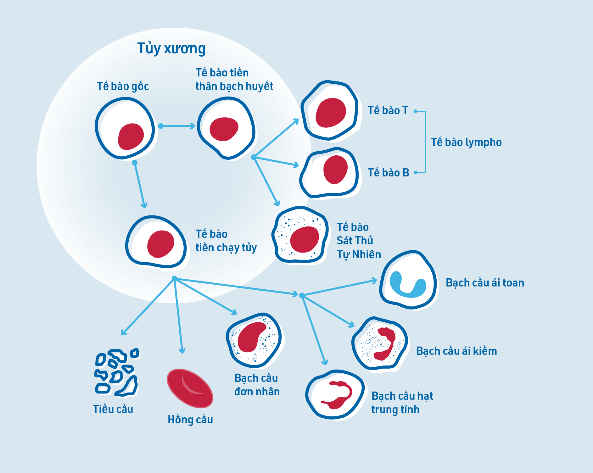 Tế bào gốc máu thích hợp cho mục đích này vì chúng là những tế bào chưa trưởng thành có thể trưởng thành thành các loại tế bào máu khác nhau và chịu trách nhiệm hình thành máu. Tế bào gốc máu được tìm thấy trong cả tủy xương và trong máu.1